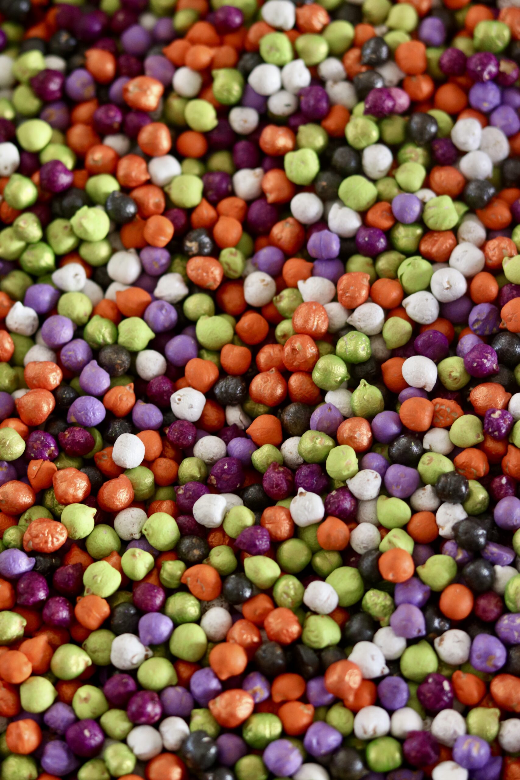 Plonge les petites mains dans un chaudron rempli de surprises ! Avec ses pois colorés dans des teintes violettes, vertes, orange, noires et blanches, ce mix sensoriel évoque aussitôt l’ambiance mystérieuse d’Halloween et des potions enchantées.