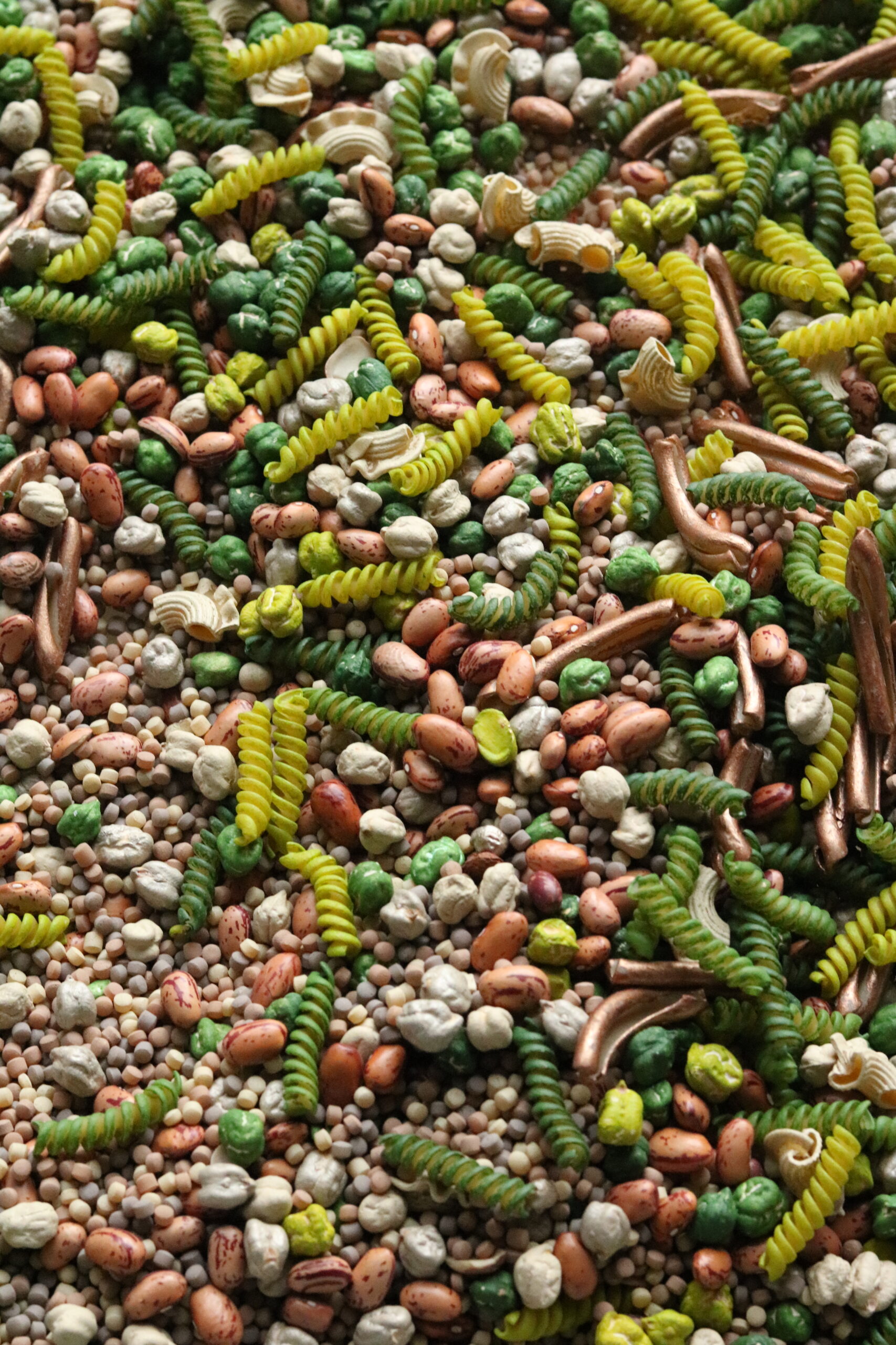 Texture variée avec des pâtes, légumineuses, formes qui accrochent le regard
